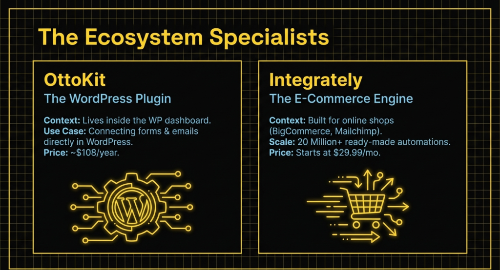 | Integrately | Yes | ~$19.99/mo | 1-click automations |