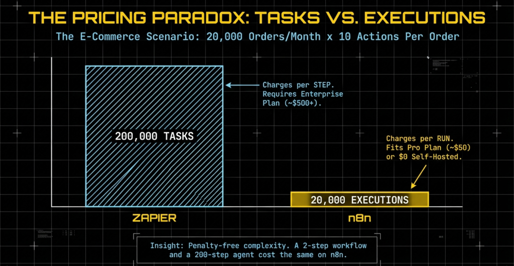 n8n counts workflow executions not individual steps. A 200-step workflow can cost the same as a 2-step one.