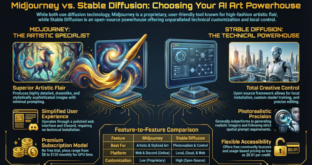 Midjourney and Stable Diffusion both turn text prompts into images, but they work very differently.